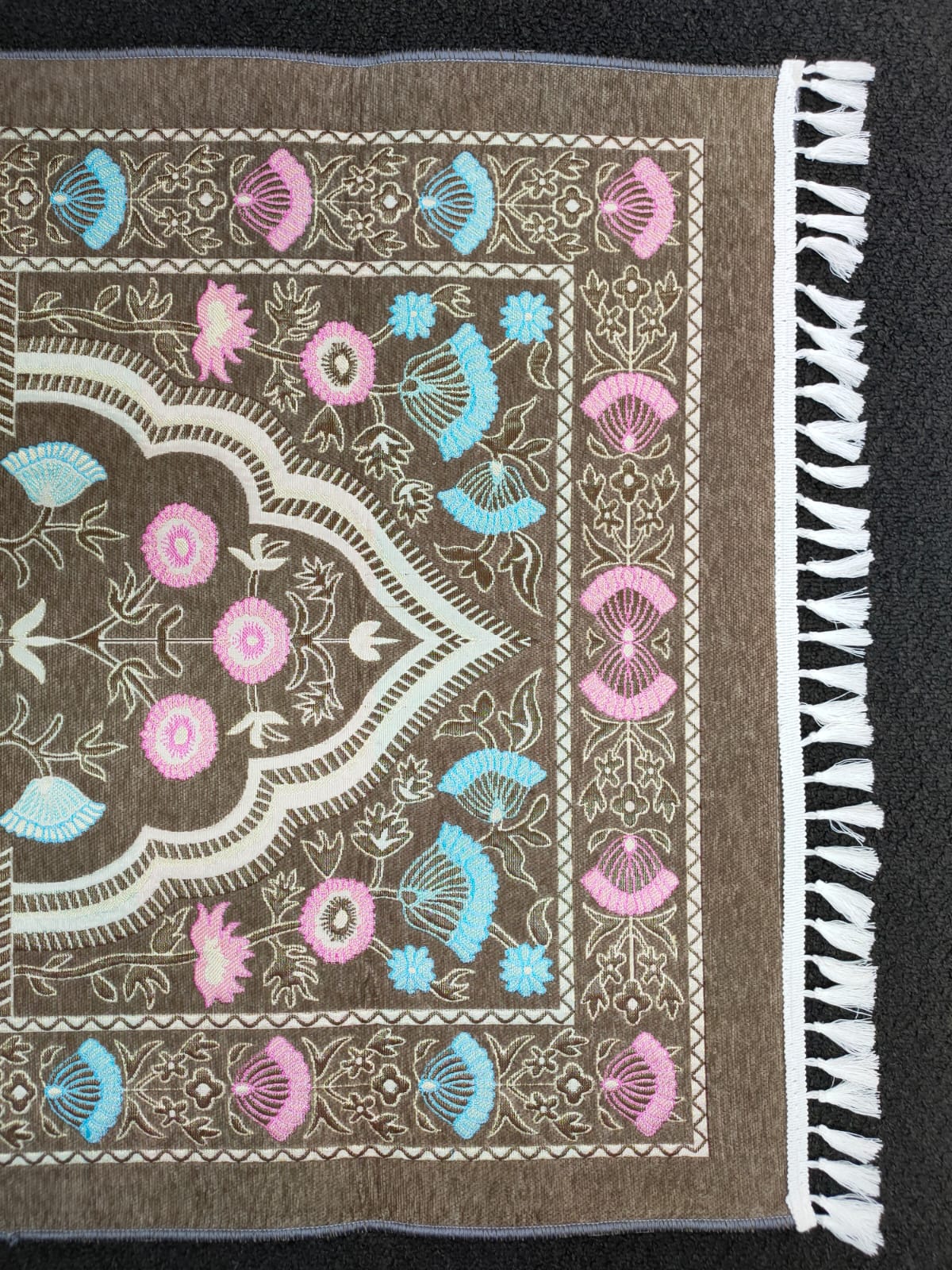 - Enjoy the beautiful floral designs of our Light Grey Prayer Mat.