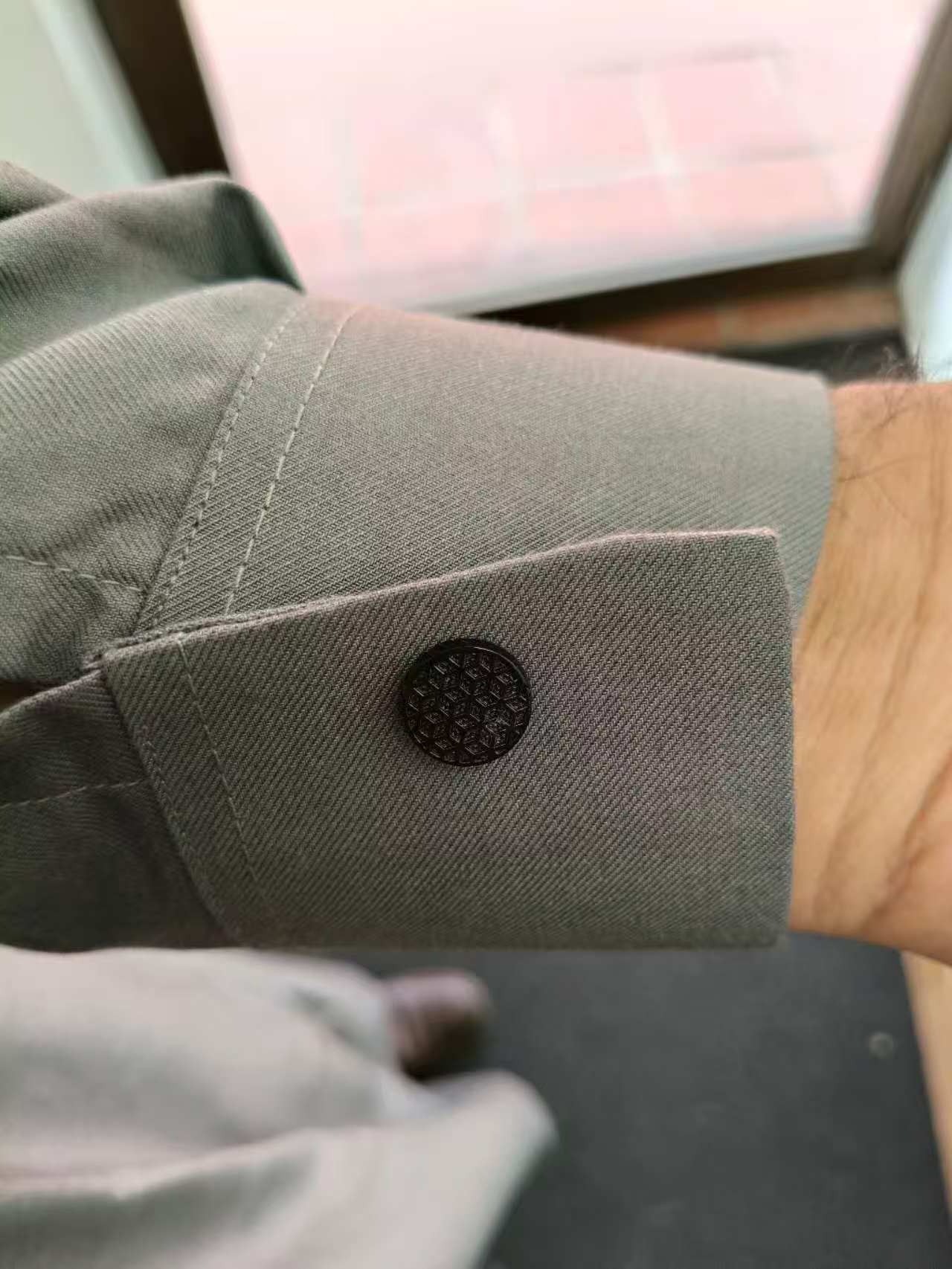 * Decorative Buttons: The front placket and cuffs are accented with unique, textured circular buttons that offer a bold contrast against the classic design.