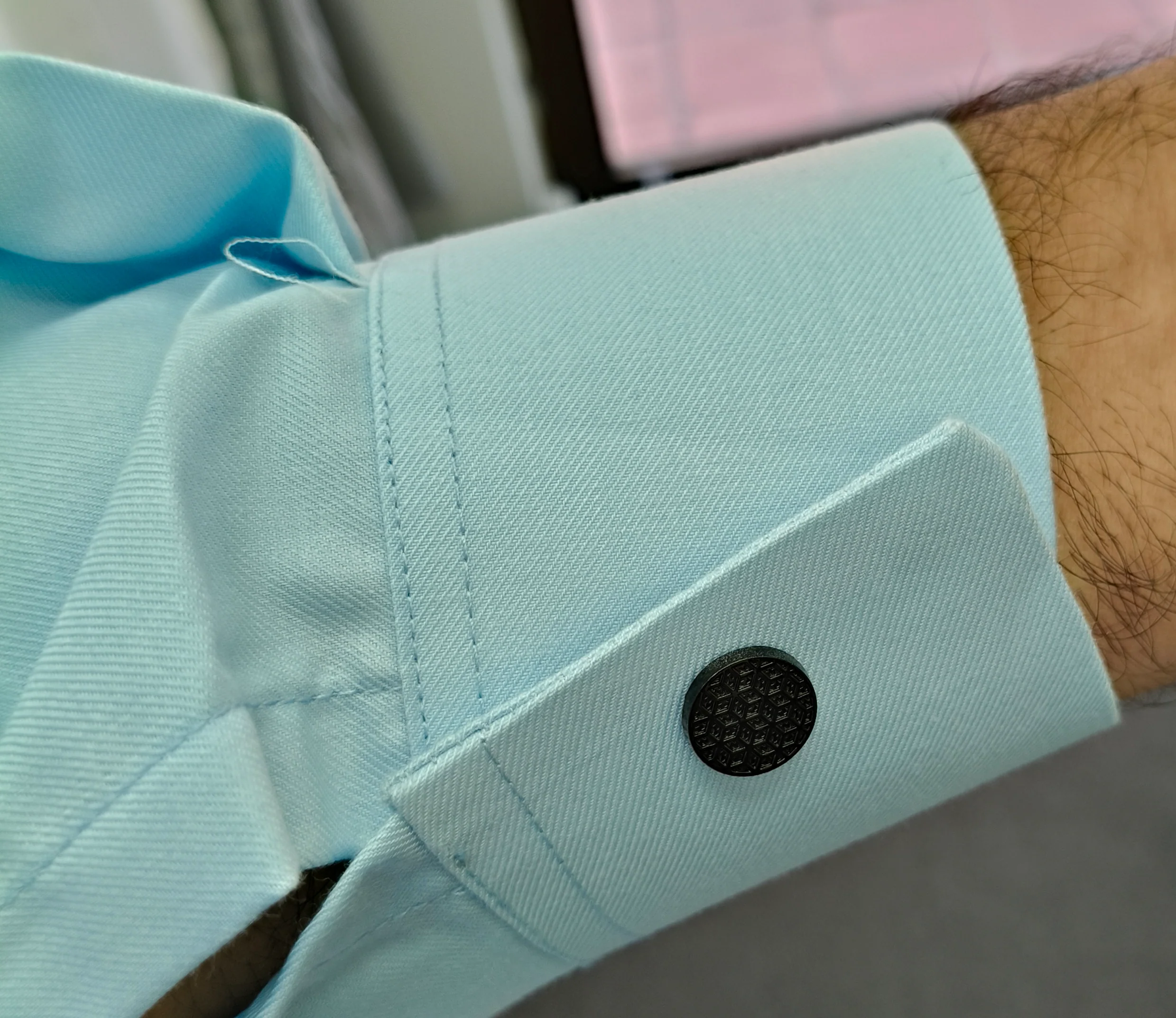 * Decorative Buttons: The front placket and cuffs are accented with unique, textured circular buttons that offer a bold contrast against the classic design.