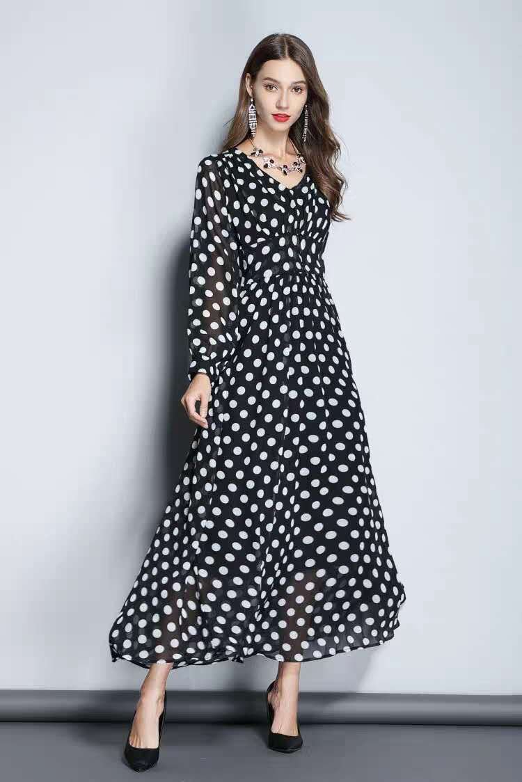 But what really sets this dress apart is its playful and retro polka dot print. The black and white dots cover the entirety of the dress, creating a fun and youthful look that is sure to turn heads wherever you go.