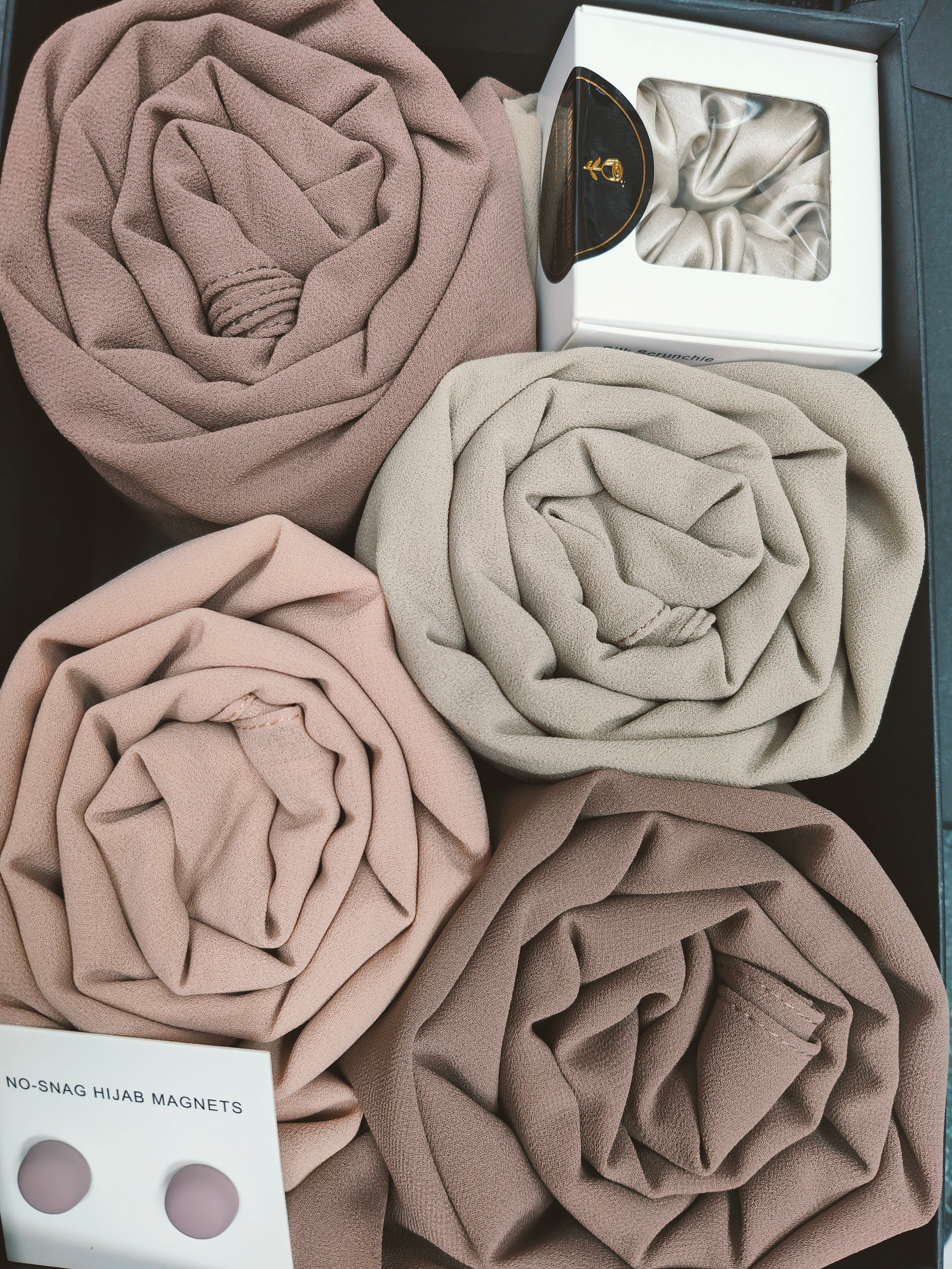 Indulge in the luxury of Hikmah Boutique's Chiffon Hijab Gift Box - The Tan Set. This gift box is the perfect embodiment of sophistication, style and elegance. This set includes 4 premium quality chiffon hijabs in the most versatile colors of light taupe, chocolate, Desert Palm and Almandine, to suit every mood and occasion.