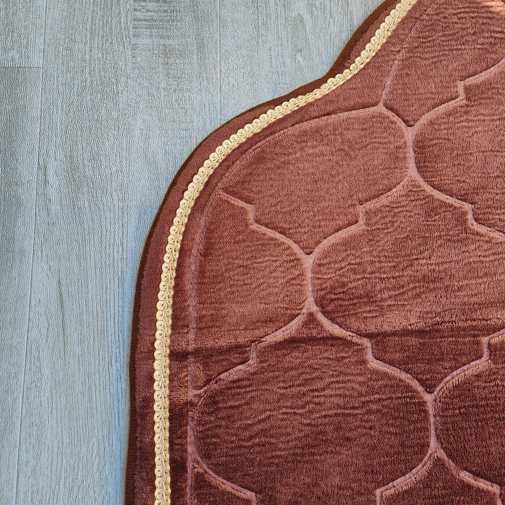 Introducing the exquisite brown color prayer mat designed by Hikmah Boutique, a true testament to craftsmanship, comfort, and style. This prayer mat, measuring 110cm by 65cm, offers a generous size for you to engage in your daily prayers with ease and serenity.