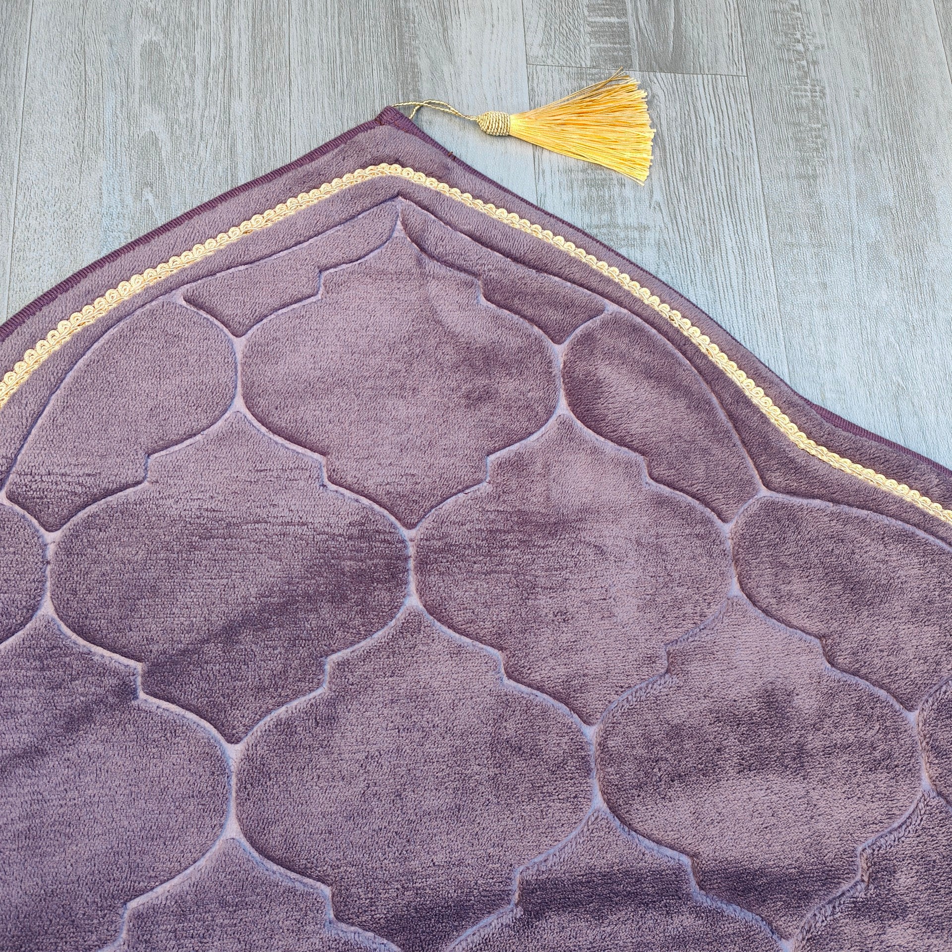 In conclusion, the Eggplant purple color prayer mat designed by Hikmah Boutique is a stunning masterpiece that combines beauty, comfort, and affordability. It is a perfect companion for your daily prayers, elevating your spiritual experience to new heights. Pray in style and comfort with this exquisite prayer mat, and let it become a cherished part of your spiritual routine.