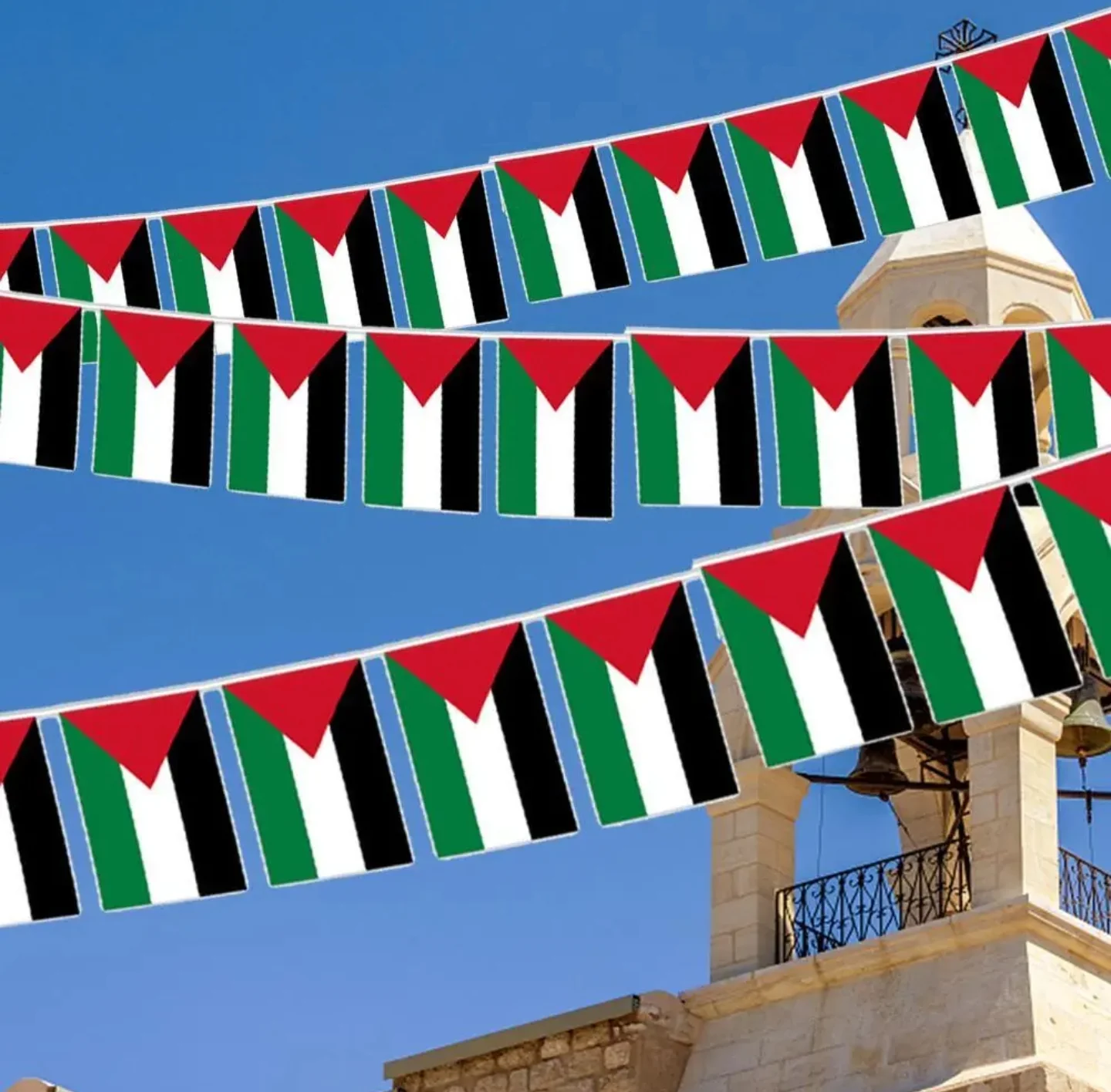 Crafted with precision and attention to detail, our Palestine Bunting Flags uphold the highest standards of quality. This set of 20 flags, each measuring 21cm by 14cm, spans an impressive 5 meters, making it a versatile and striking addition to various settings—from intimate gatherings to larger community events. Whether indoors or outdoors, these flags stand as powerful symbols that transcend boundaries and tell a story of perseverance.