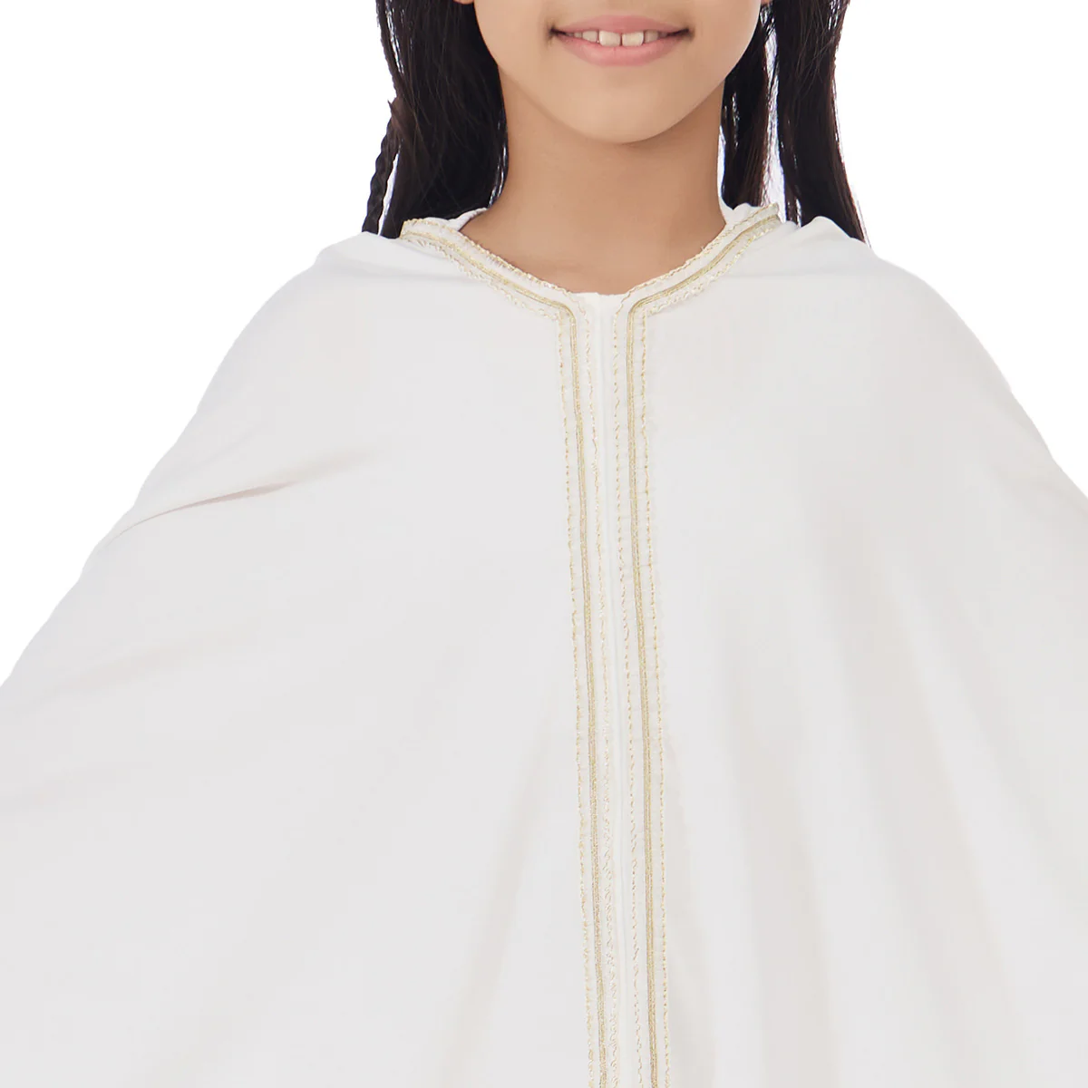 This simple yet elegant Girls Prayer Set comes with an instant-wear sleeveless jilbab and a matching maxi skirt. This white girls prayer set is a convenient, full-coverage outfit designed for ease and speed, typically featuring subtle yet elegant golden details to add a touch of charm.Â